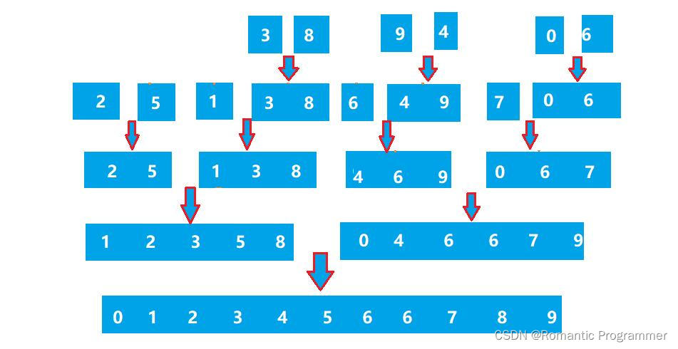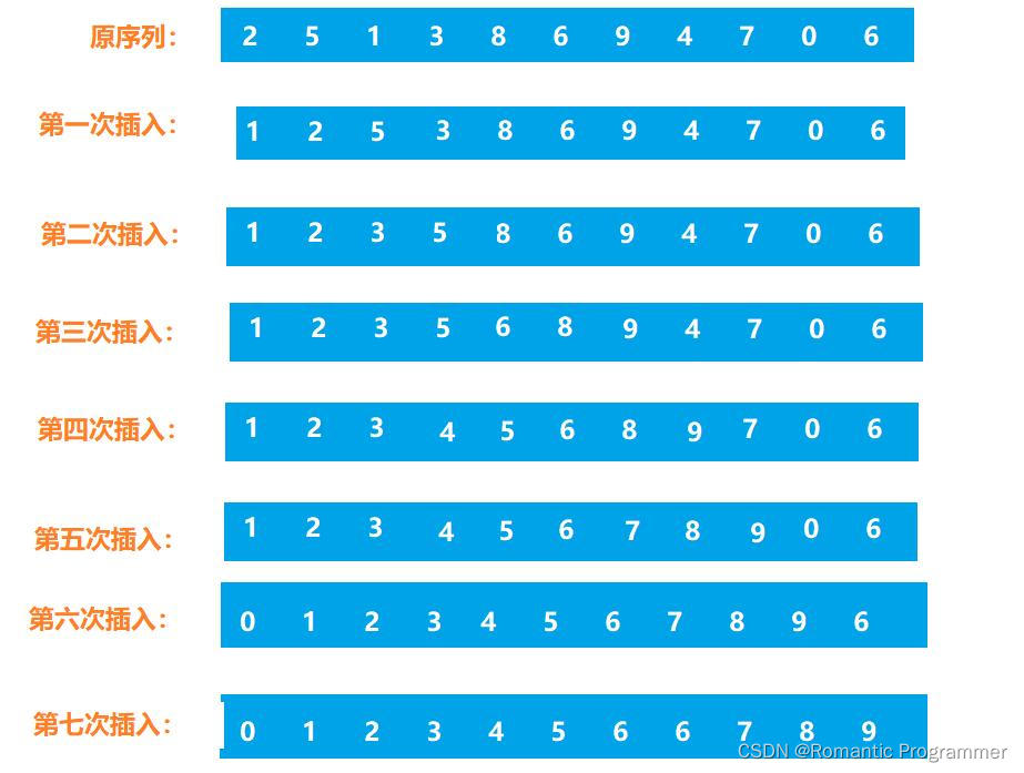 说明:第一个元素默认它有序,所以从第二个元素开始进行比较然后插入,5比2大,继续下一个,将1依次比较插入2前面,将3依次比较插入5前面,8比5大,不用管,继续下一个,将6依次比较插在8面,9比8大,不用管,将7依次比较,插在8前面,将0依次比较插在1前面,将6依次比较插在7前面,插入完成。