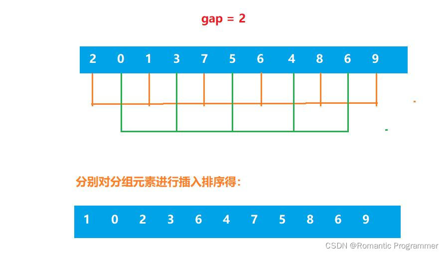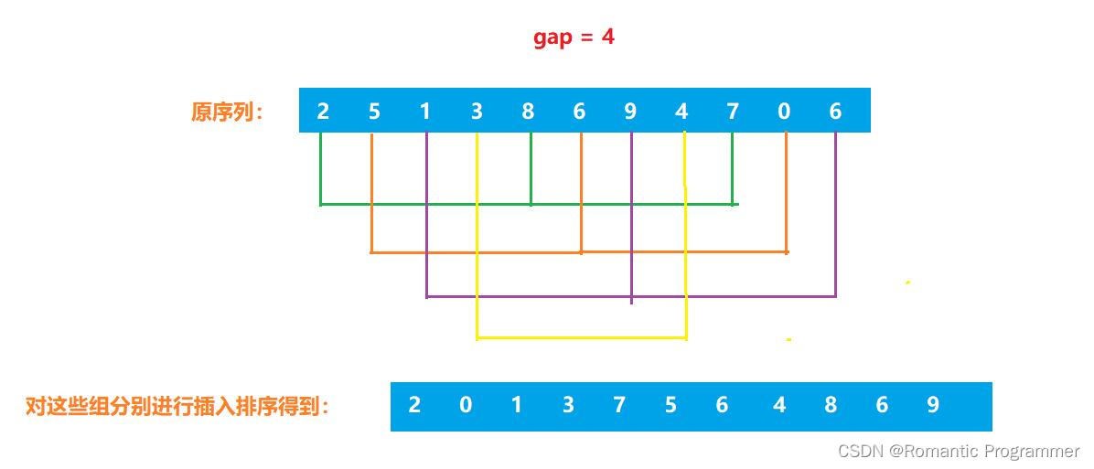 说明:gap为间隔,这里依次将gap=4,2,1,先把间隔为4的数据元素用插入排序排好序,再利用插入排序排gap=2 的数据元素,依次重复上述操作,即可。