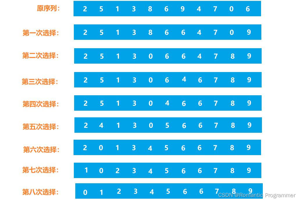 每一次从待排数据元素中选出最小(最大)的元素,存放在序列的起始(末尾)位置,直到全部待排序的数据元素全部排完。