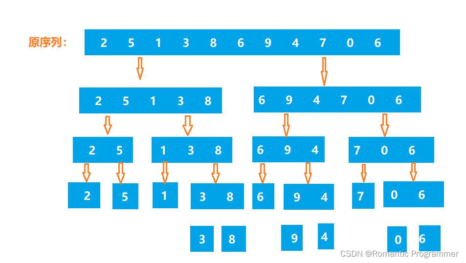 归并排序是将两个有序序列进行合并,但是我们拿到是一个数组,所以得先将数组递归均分为两部分,再将两部分进行合并。