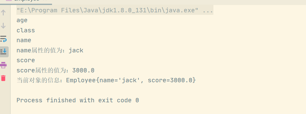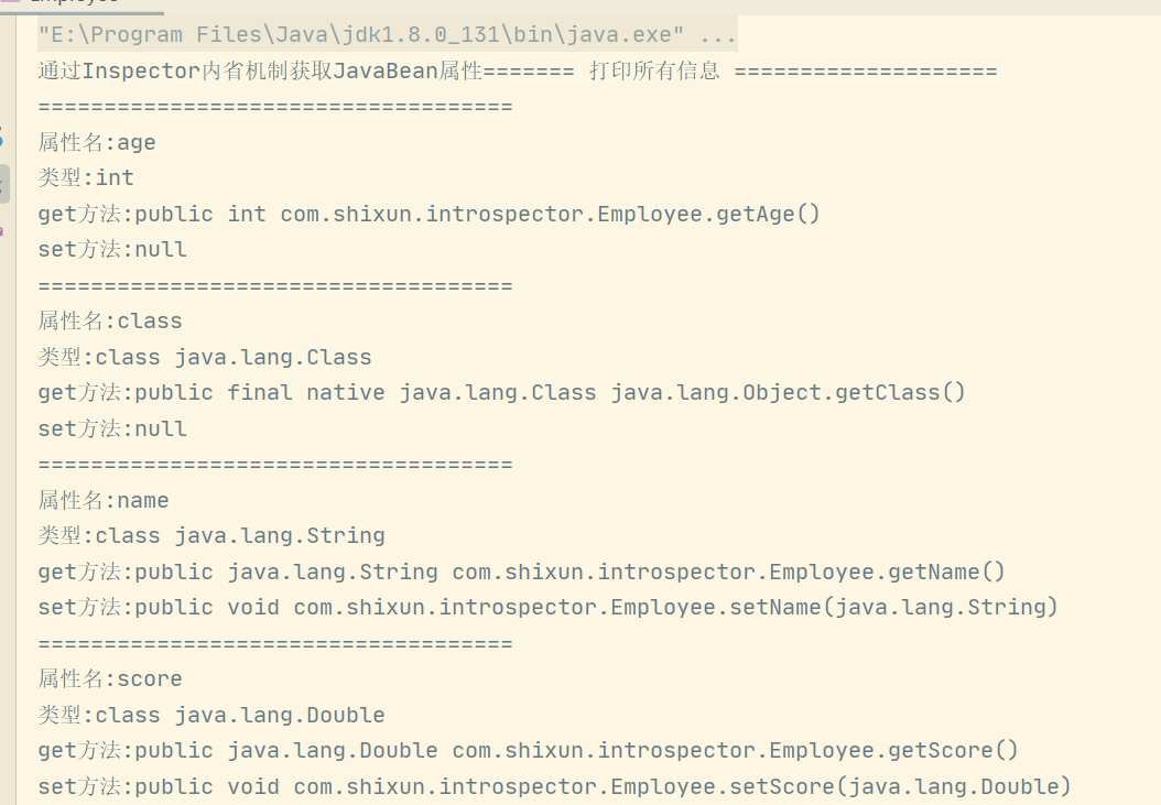 System.out.println("通过Inspector内省机制获取JavaBean属性======= 打印所有信息 ====================");