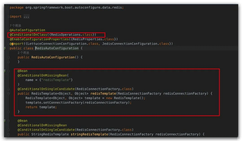 我们可以看到这个文件中有一个 RedisAutoConfiguration 配置类,在这个配置中就有我们需要的 RedisTemplate 类的 Bean,同时也可以看到,在类上面有一个 @ConditionalOnClass({RedisOperations.class}) 注解,表示只要在类路径上有 RedisOperations.class 这个类的时候才会进行实例化。这也就是为什么只要我们添加了依赖,就可以自动装配的原因。