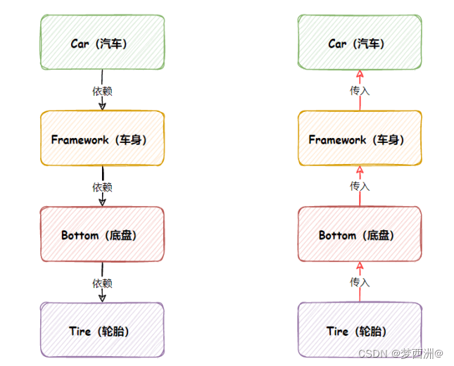 在传统的代码中对象创建顺序是:Car -> Framework -> Bottom -> Tire