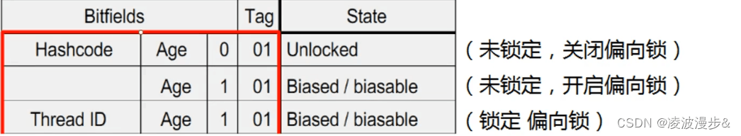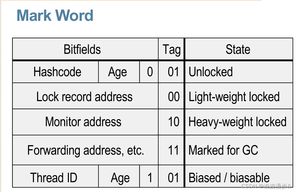 "Mard Word"在32位和64位的虚拟机(未开启压缩指针)中分别为32位和64位。32位虚拟机"Mark Word"如下: