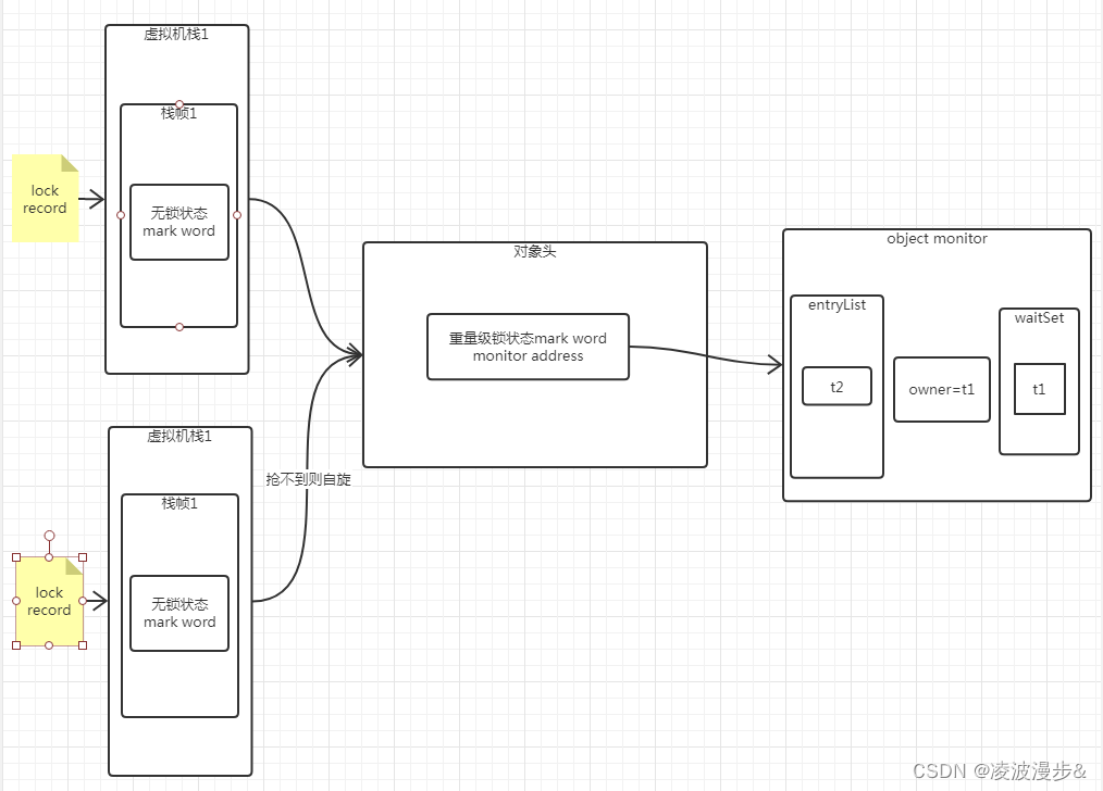重量级锁是通过object monitor(对象监视器)实现的,对象监视器包括entryList(锁池)、owner(持锁者)、waitSet(等待集合)等。
