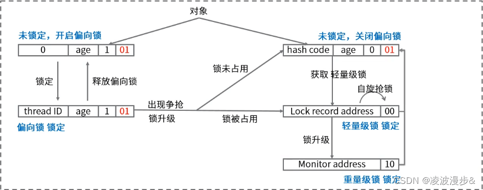 - 当锁未被占用时,会升级为无锁,无锁再升级为轻量级锁,再由轻量级锁升级为重量级锁。