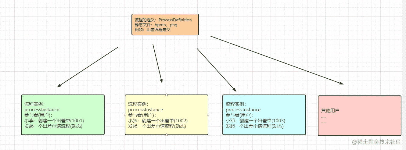 例如:用户或者程序安装流程定义的内容发起了一个流程,这个就是一个流程实例