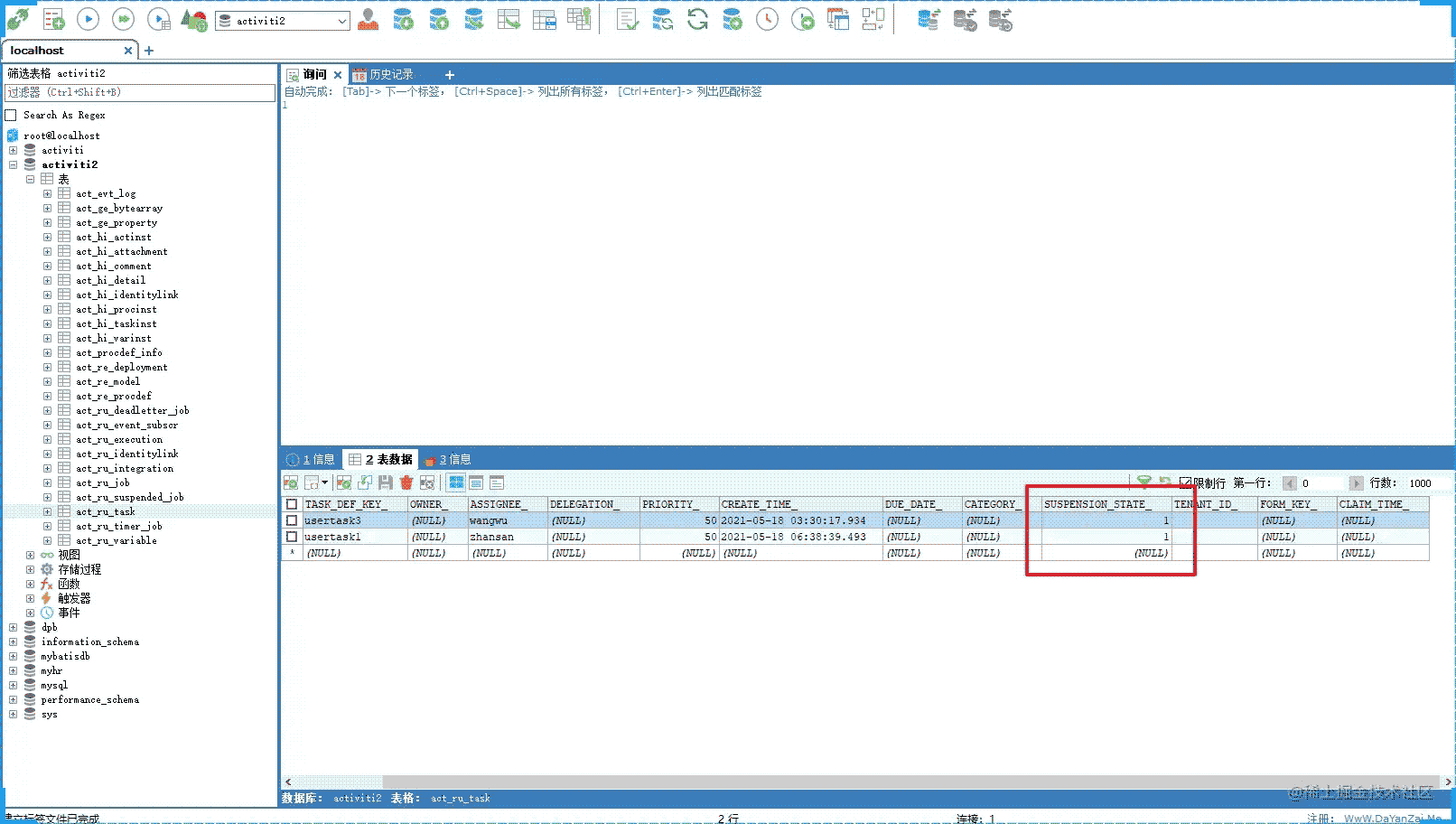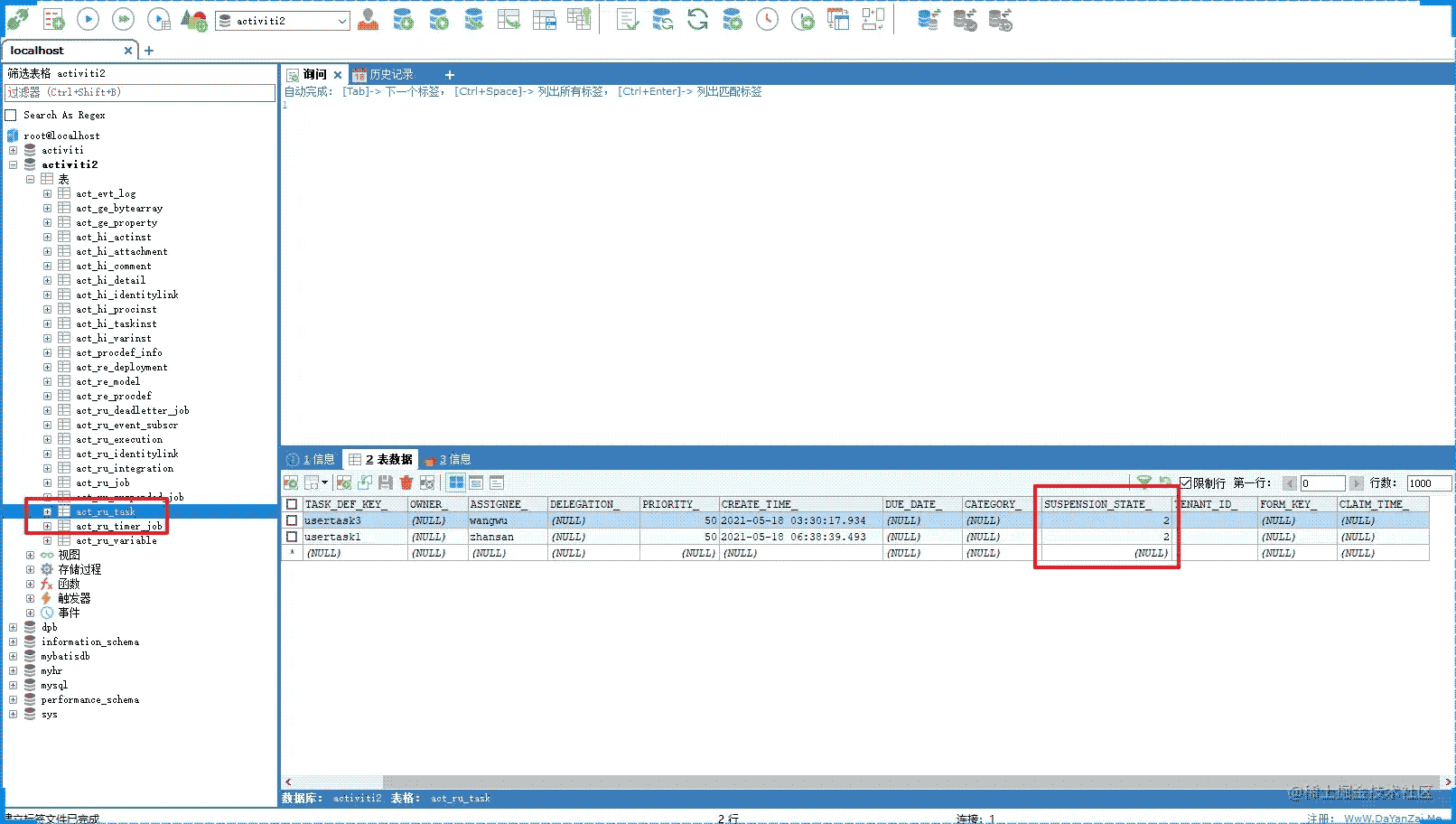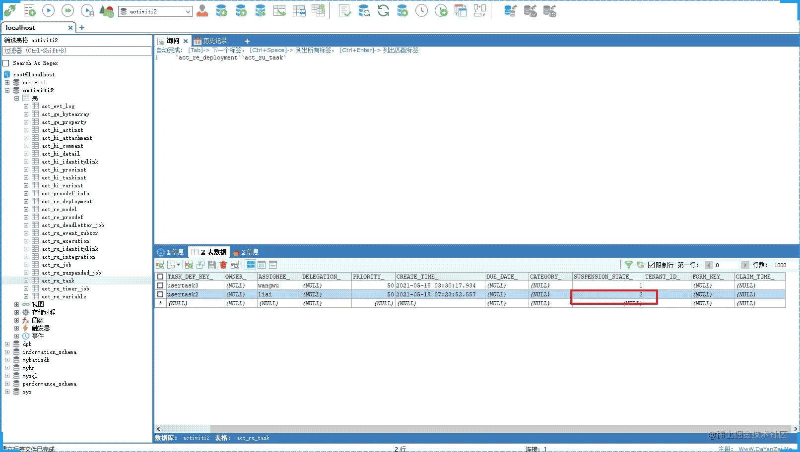 挂起流程定义后,对于的实例对象中的状态会修改为2