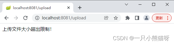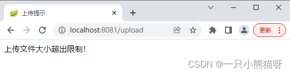 只需在系统中定义 CustomExceptionHandler 类,然后添加 @ControllerAdvice 注解即可。当项目启动时,该类就会被扫描到 Spring 容器中,然后定义 uploadException 方法 , 在该方法上添加了 @ExceptionHandler 注解,其中定义的 MaxUploadSizeExceededException.class 表名该方法用来处理 MaxUploadSizeExceededException 类型的异常。如果想让该方法处理所有类型的异常,只需将 MaxUploadSizeExceededException 改为 Exception 即可。方法的参数可以有异常实例、HttpServletResponse 以及 HttpServletRequest 、 Model 等,返回值可以是一段JSON、一个ModelAndView 、一个逻辑视图名等。此时上传一个超大文件会有错误提示给用户,如下: