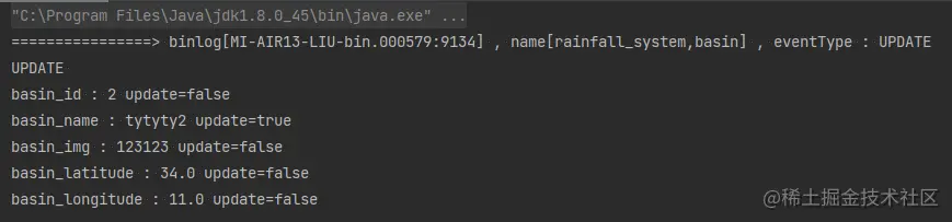 System.out.println(String.format("================> binlog[%s:%s] , name[%s,%s] , eventType : %s",