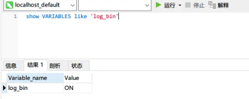 改了配置文件之后,重启 MySQL,使用命令查看是否打开 binlog 模式: