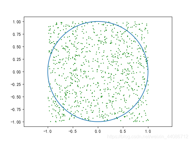采用蒙特卡洛思想,首先在一个正方形区域内随机生成若干个均匀分布的点,随后判断哪些点在正方形的内切圆范围内。如果点的数量足够多,那么圆内点的数量与点的总数量的比值,就是圆的面积与正方形面积之比。利用点数量的比值与正方形面积就可以推出圆的面积,进而得出圆周率π。