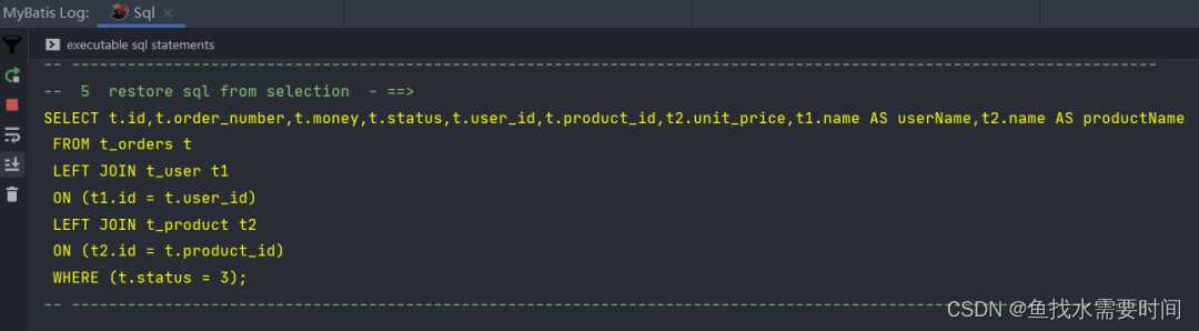 我们用插件读取日志转化为可读的sql语句,可以看到两条左连接条件都被正确地添加到了sql中: