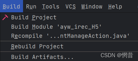 Build Project:对选定的目标(Project),编译那些被修改的文件;Build Module:对选定的目标(Module),进行强制性编译,不管目标是否是被修改过。Recompile:对选定的目标(Java 类文件),进行强制性编译,不管目标是否是被修改过。Rebuild Project:对选定的目标(Project),进行强制性编译,不管目标是否是被修改过。由于 Rebuild 的目标只有 Project,所以 Rebuild 每次花的时间会比较长。Build Artifacts:在下拉框内选择想要打包的项目,进行对应的:build、Rebuild、Clean、Edit等操作