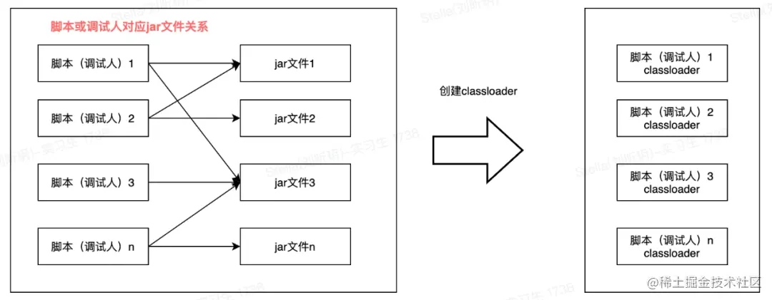 一个脚本对应多个依赖的JAR文件(JAR文件在脚本调试页面上传到HDFS),一个脚本对应一个classloader(并进行本地缓存)(完全相同的两个类在不同的classloader中加载后两个Class对象是不相等的)。