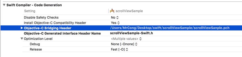 2.找到Swift Compiler - Code Generation 集合,从中配置Objectie-C的桥接文件:Objective-C Bridging Header ,写入相同的pch文件路径