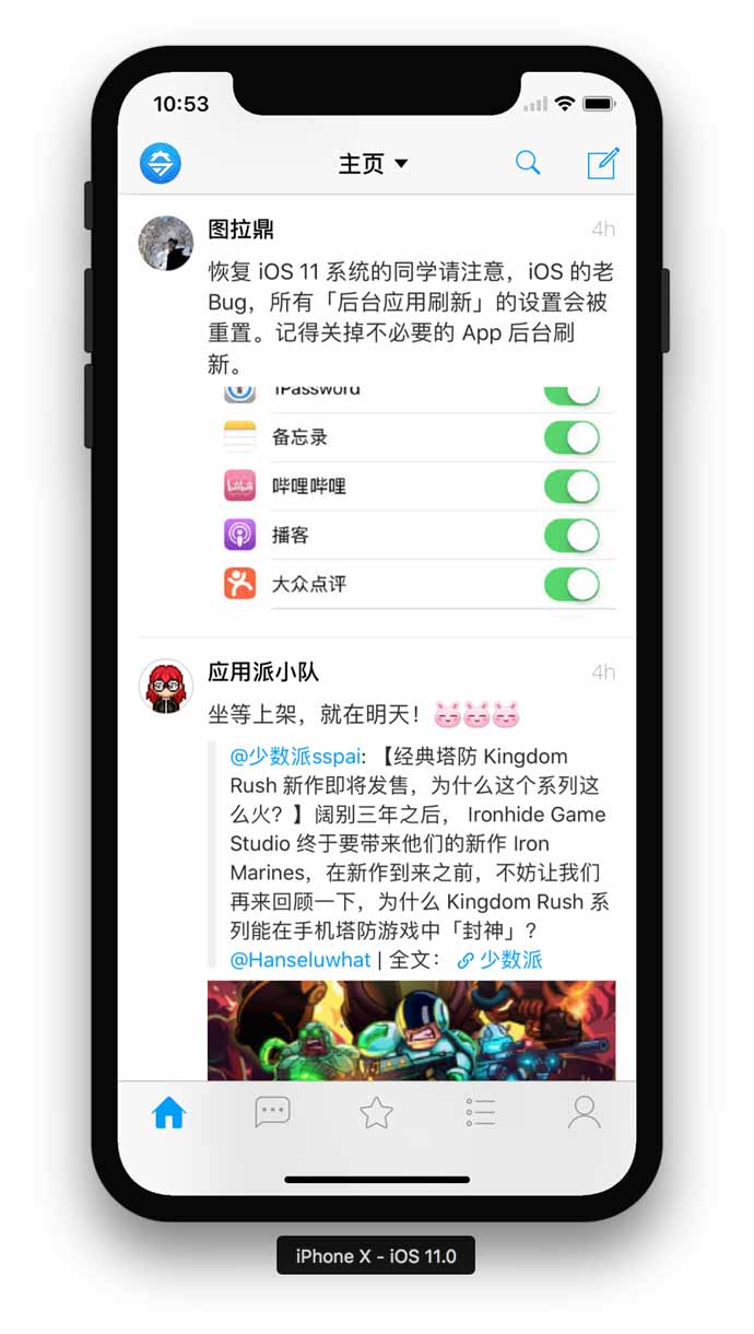 除非你的 App 全部使用了 iPhone 原生组件、AutoLayout 等等,否则我想它或多或少存在着在 iPhone X 上的兼容性问题。就拿奇点来说吧,早上我下载完 Xcode 9 GM,然后在 iPhone X 模拟器跑起了它,很快我就看到了 break:我自定义 TabBar 的问题。