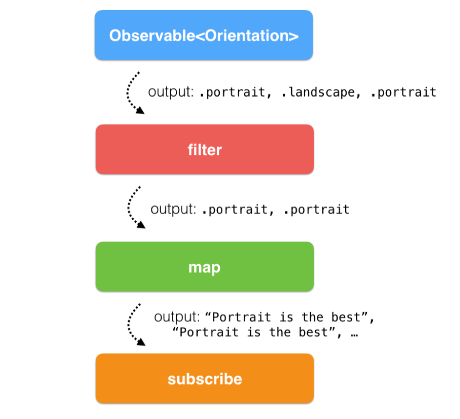 上面的代码中,我们首先会将所有 .landscape 方向过滤掉不做任何处理。然后,我们再将剩下的 portrait 转化为字符串 Portrait is the best! 。整个处理流程大致如下:
