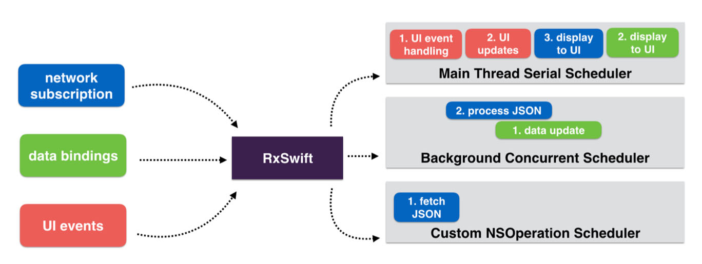 我们将左侧的任务用不同的颜色加以区分,然后在右侧任务被拆分为不同的步骤并且放在不同 Schedulers 中。例如,network subscription 任务就被拆分为三个步骤并依次放入了 Custom NSOperation Scheduler 、Background Concurrent Scheduler、Main Thred Serial Scheduler 。