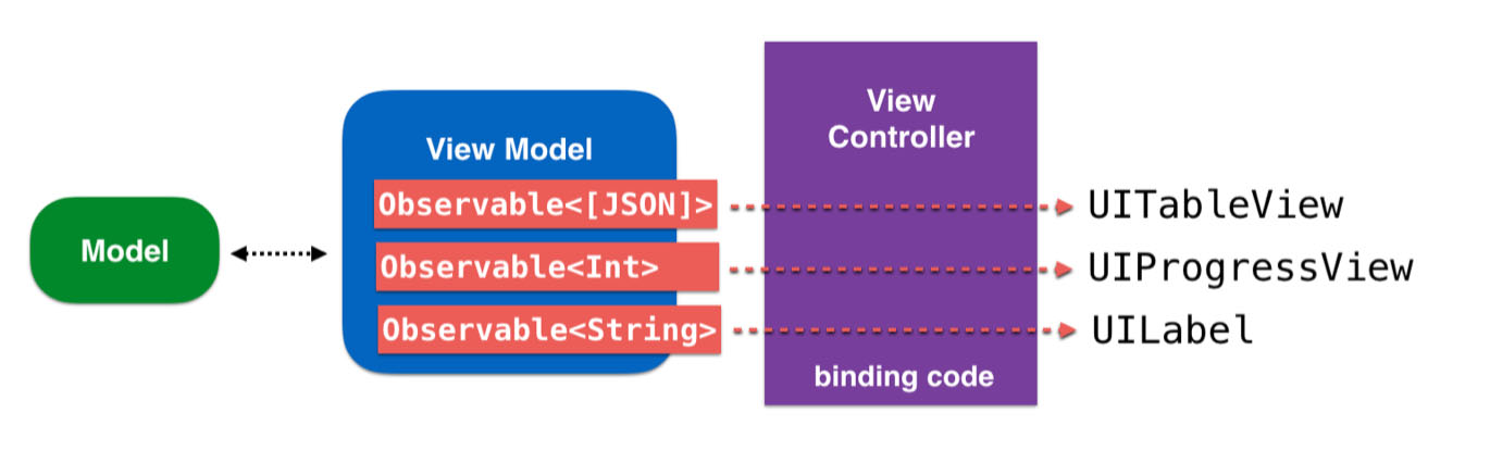 值得注意的是, RxSwift 并没有对客户端的应用架构作出硬性规定。这意味着,我们可以在已有项目中引入 RxSwift 进行响应式编程实践。当然已有框架中必定存在一个最适合 RxSwift 的,而它就是 MVVM。因为在 MVVM 中我们可以将 VM 中的部分属性直接与 UI 进行绑定。