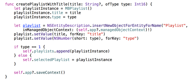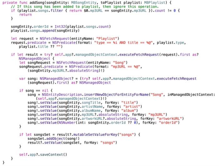 先说说我遇到了什么问题,我想将属于一个歌单的所有 Song 实体添加到 Playlist 实体的 songs 这个 Relationships 中去,但是发现怎么加都加不进去。我已开始的做法是先用 valueForKey 拿到 songs 属性所代表的 NSManagedObject,然后强制转换到 NSMutableSet 然后执行添加操作,发现人家压根不鸟我这个操作,虽然没有抛异常,也没有任何 log 打出,但是 “It does NOT work!!!”。