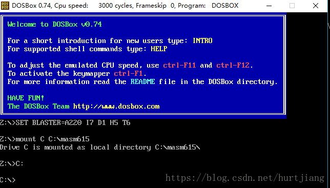 3. DOSBox软件中输入命令mount C C:\masm615(假设masm615安装在C盘),回车输入C: