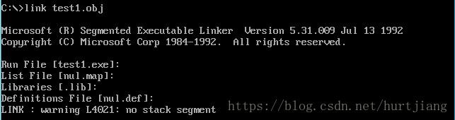 6. Dosbox软件运行link test1.obj, 生成exe文件