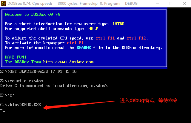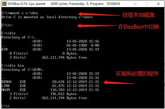 3. 将前面提到过的debug.exe等文件都放在这个挂载的本地磁盘路径下(例如C:\dos),通过DOSBox就可以兼容的运行masm工具包中的程序和debug.exe了