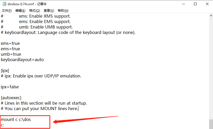 找到DOSBox安装目录下的DOSBox 0.74 Options.bat,使用系统自带的记事本直接打开,暂不研究其它配置段的作用,找到最后的【autoexec】段,配置在【autoexec】的内容会作为命令在DOSBox启动时按顺序被自动执行。
