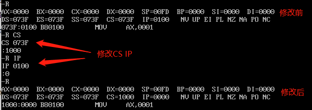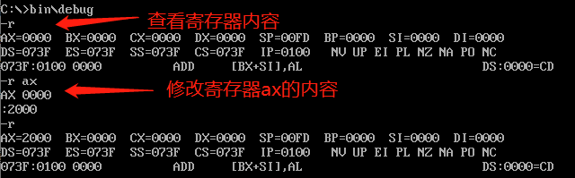 (-r 寄存器名) r加上寄存器名可以在接下来的":"提示后输入新的值,以达到修改对应寄存器内容的目的(示例中第二行 AX 0000表示修改前寄存器AX的值为0000)