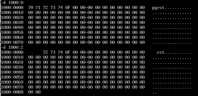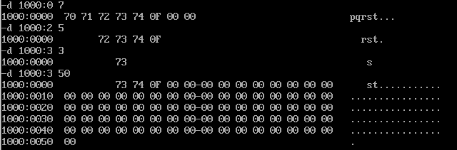 D命令提供了另外一种访问内存的方式(段地址:偏移起始地址 偏移终止地址),其能够展示(段地址:偏移起始地址 至 段地址:偏移终止地址)的内存信息,范围两端均为闭区间。
