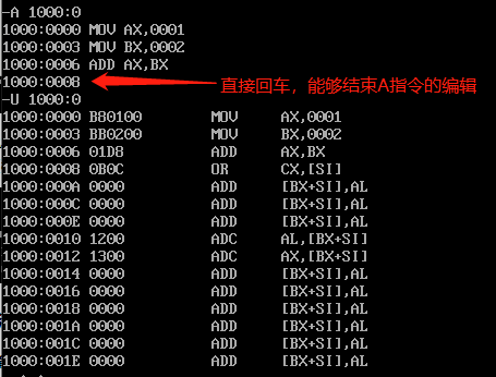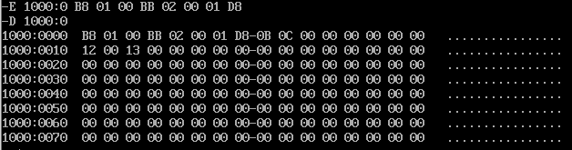 我们可以向内存1000:0处写入这些机器指令,以供接下来通过debug执行这段机器指令 (执行命令:E 1000:0 B8 01 00 BB 02 00 01 D8)。