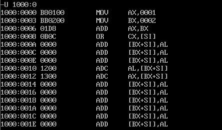 对于前面我们在1000:0处输入的机器指令,使用 U 1000:0 命令(u 内存地址)可以将内存中的数据以汇编语言指令的方式进行展示。