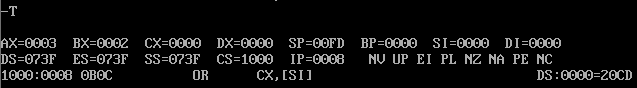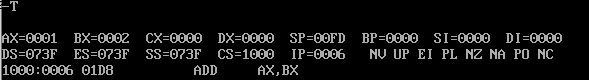 最后执行一次T命令,add ax,bx会被执行(类似 ax=ax+bx)。寄存器ax的值已经变成了之前寄存器ax和bx中的数据之和0003;寄存器IP的值增加了2(add ax,bx的指令长度是2),CS:IP指向1000:8。
