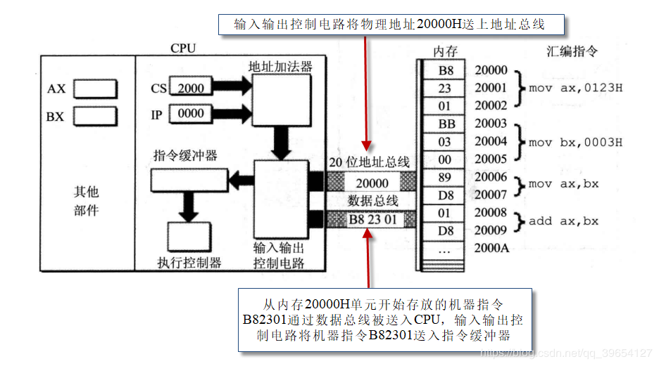 地址加法器采用物理地址 = 段地址×16 + 偏移地址的方法用段地址和偏移地址合成物理地址。
