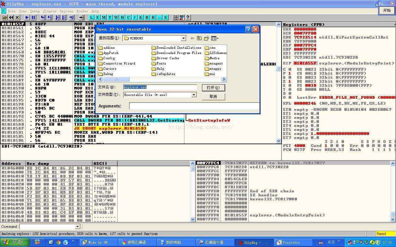需要使用汇编来演示如下代码 需要下载ollydbg汇编调试器 点击File-Open随意打开一个exe文件 我这里随便找到c:/windows/explorer.exe文件
