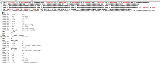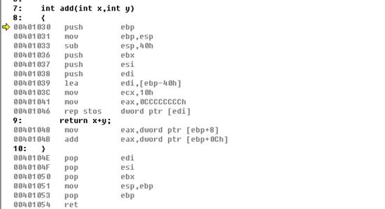 这里是我们自己写的汇编代码,编译器也没有改动过可以说是本色出演,这里内存没有变化,好,那么我们接着来看add函数这里的调用