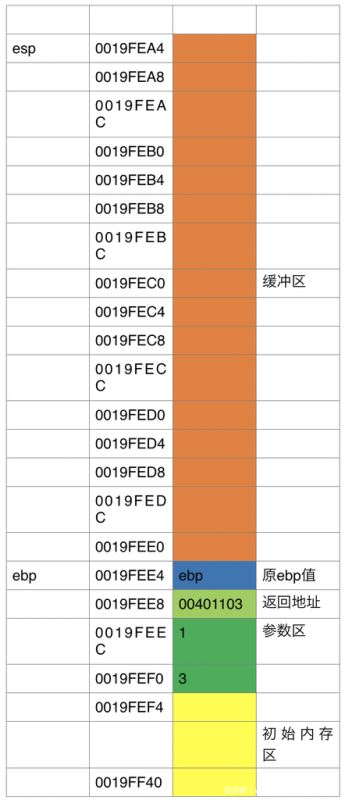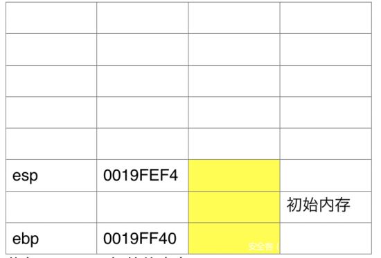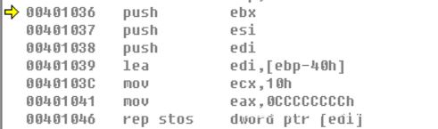 接着向栈中推入了ebx,esi,edi,栈顶指针[esp-Ch],然后lea指令将[ebp-40h]的地址放入edi中,给ecx赋值为10h=16,也就是循环16次又将0xCCCCCCCCh赋给eax,这也被称为断点字符,然后使用rep指令将缓冲区中的值赋值为0xCCCCCCCCh,现在我们再来看看堆栈中的变化