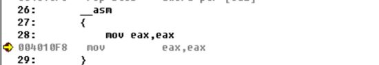 我们先写一句汇编代码,mov eax,eax其实这句代码并没有什么用,也就是将eax的值移入eax中,这句代码对于我们的作用仅作为断点,我们F5运行下程序并且切换到反编译界面