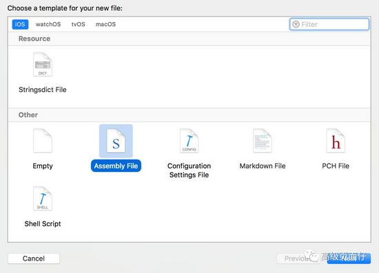 除了嵌入式内联汇编外,我们还可以使用汇编文件来直接定义函数,在Xcode中新建文件时,选择Other组中的汇编文件,即可创建一个汇编文件并将其添加到工程的编译单元中。