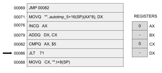 循环体的最后一条指令是 ADDQ DX, CX 表示“将DX添加到CX”。之前我们已经看到DX包含循环的当前值,而CX是包含变量 t 内容的寄存器: