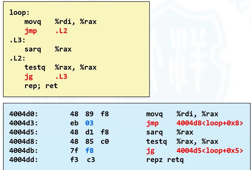 - 结合实例进行理解:在未执行jmp指令时,rip寄存器存储的地址为4004d5(rip寄存器存放即将加载的指令地址);执行jmp指令后,rip寄存器的值改为新的目标位置地址,目标位置=原先位置+偏移量,在此例子中为4004d5+03=4004d8。jg指令同理