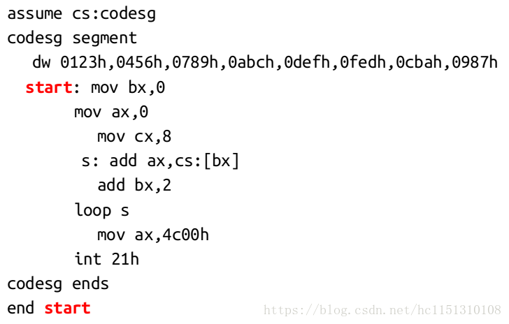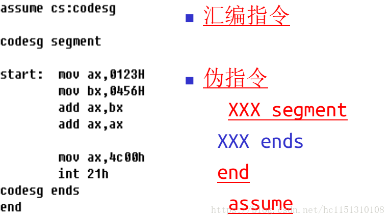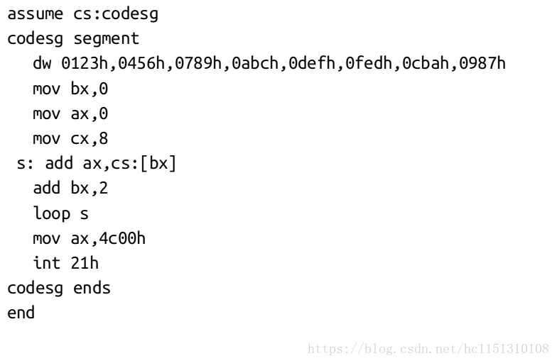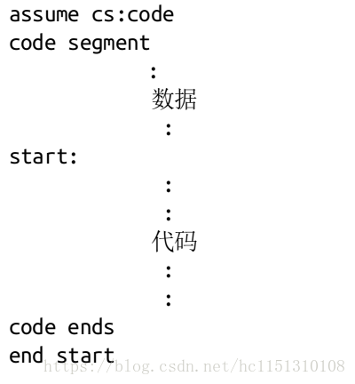 codesg:放在segment的前面,作为一个段的名称,这个段的名称最终将被编译、连接程序处理为一个段的段地址。
