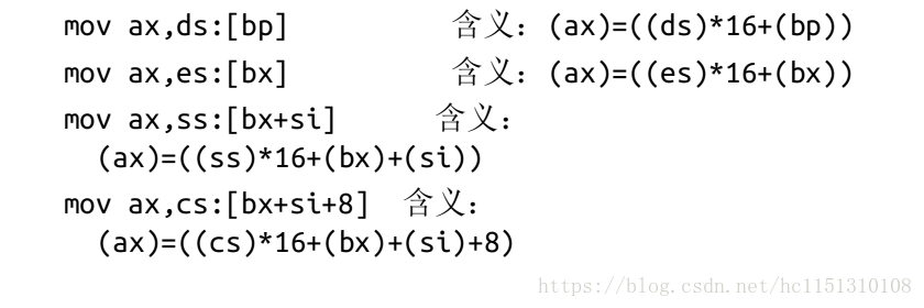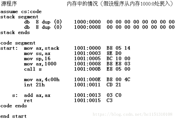 程序加载后,ds中存放着程序所在内存区的段地址,这个内存区的偏移地址为 0 ,则程序所在的内存区的地址为:ds:0;
