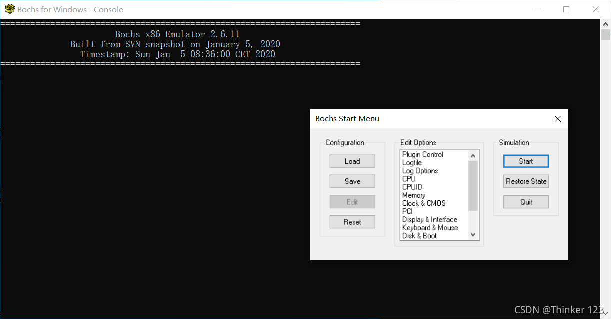 点击ok后会退到Bochs start menu菜单, 点击start即可启动调试