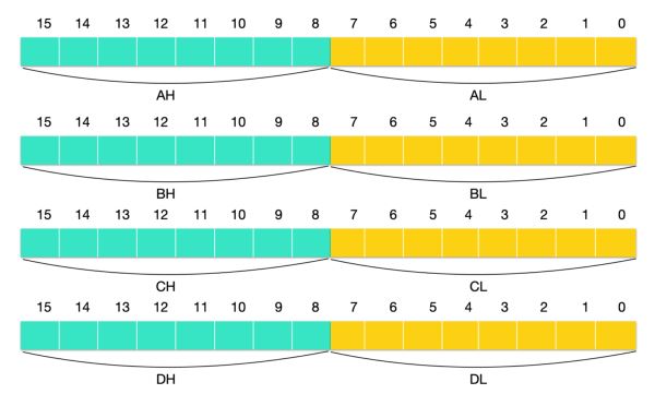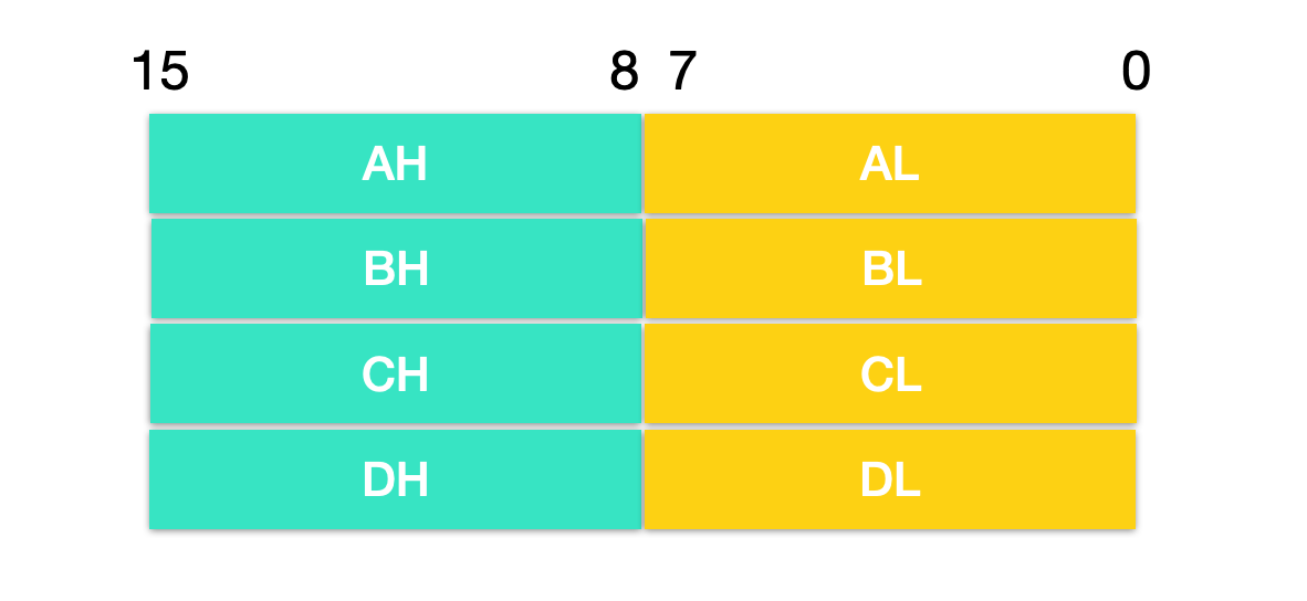 8086 CPU 的上一代寄存器是 8080 ,它是一类 8 位的 CPU,为了保证兼容性,8086 在 8080 上做了很小的修改,8086 中的通用寄存器 AX、BX、CX、DX 都可以独立使用两个 8 位寄存器来使用。