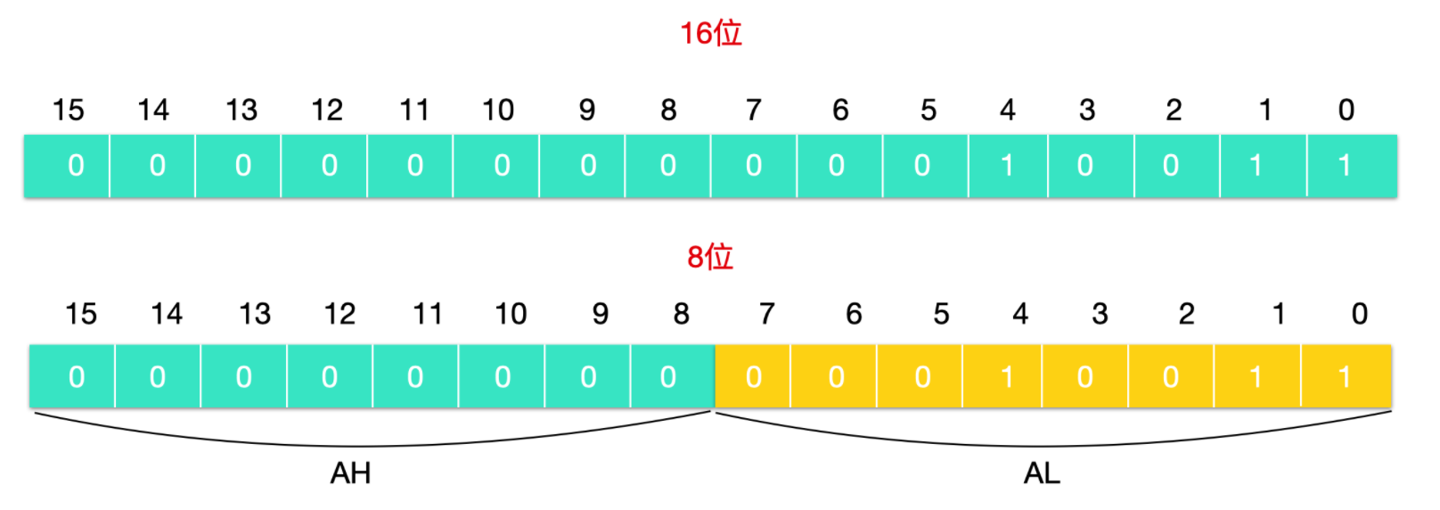 AX 的低位(0 - 7)位构成了 AL 寄存器,高 8 位(8 - 15)位构成了 AH 寄存器。AH 和 AL 寄存器是可以使用的 8 位寄存器,其他同理。
