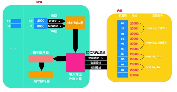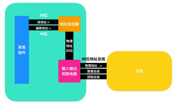 由地址加法器计算出物理地址通过输入输出控制电路将物理地址送到内存中
