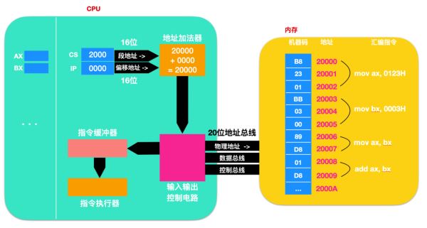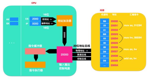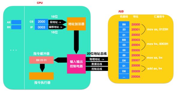 然后下面再把 2000 和 0003 送到地址加法器中再进行后续指令的读取。后面的指令读取过程和我们上面探讨的如出一辙,这里 cxuan 就不再赘述啦。