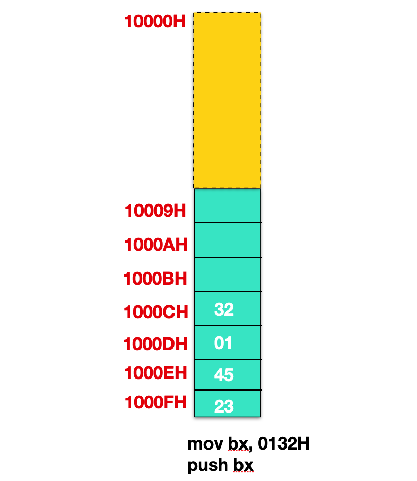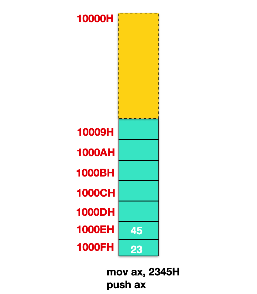 而当使用 PUSH 指令向栈中压入 2 个字节的字单元时,SP = SP – 2 ;即栈顶元素也要发生变化;